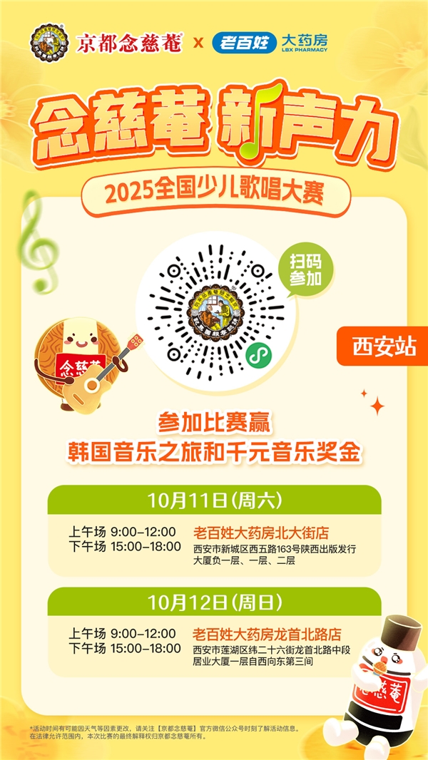 承载百年护嗓匠心,唱响新时代好声音!百年品牌京都念慈菴再度启幕少儿音乐盛宴—— 第三届 “念慈菴・新声力” 全国少儿歌唱大赛将在2025年10月11日至12日来到西安开展线下海选。每段旋律,都是童心深处的回响;每次登台,都是成长路上的熠熠星芒。我们期待每个热爱音乐的孩子们,都能在梦想的舞台上尽情绽放,一起唱响念慈菴好声音,唱响未来!